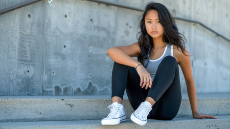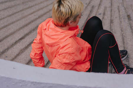 Athletic young woman in casual sportswear sitting on concrete steps