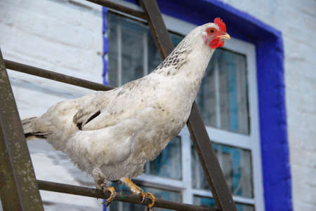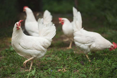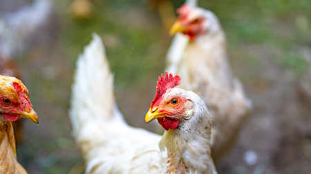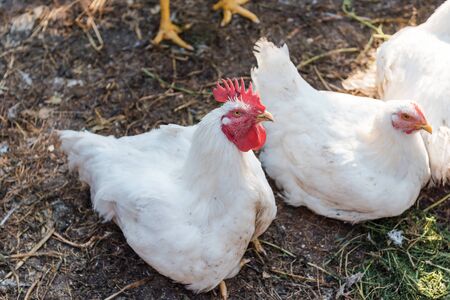 White hen looking for food in the farm yard. Chickens. Free Range Cock and Hens