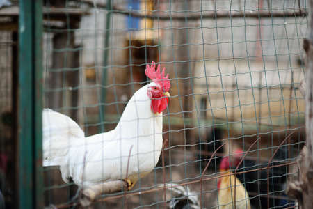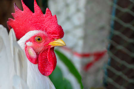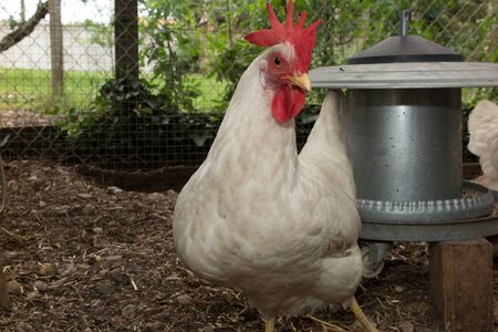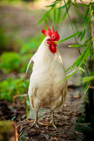 White fat rooster on backyard. White cock with red crest and beard. Chicken breed with white feather. Red comb and wattle of rooster. Fat fluffy chicken male. Domestic bird on farm yard