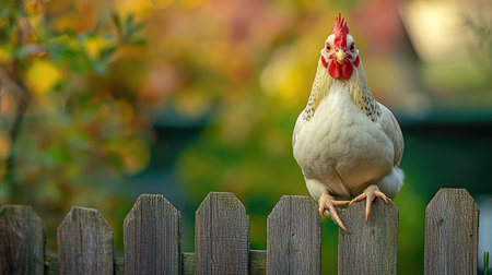 A beautiful white chicken standing on a wooden fence blends harmoniously with the vibrant colors of a lush autumn garden, showcasing tranquil rural life.
