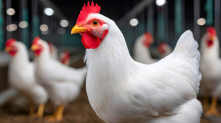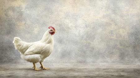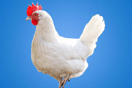 Detailed full-body shot of a white chicken, standing tall with soft feather textures clearly visible.