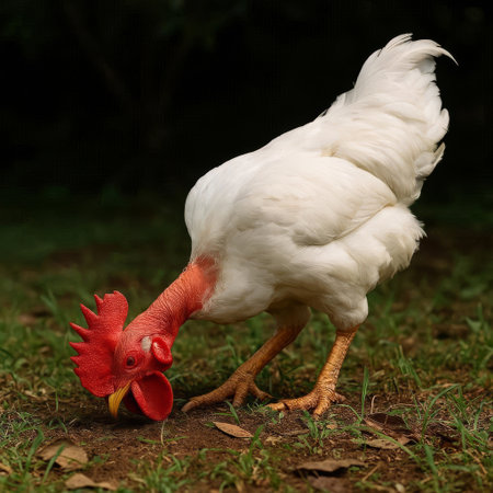 AI-Generated image of a white naked neck rooster bending low to peck at the ground. Its bright red comb and wattles dominate the head and neck area.