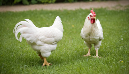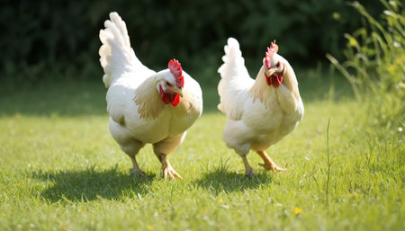 Chickens walking on fresh green grass, symbolizing organic farming and healthy lifestyle