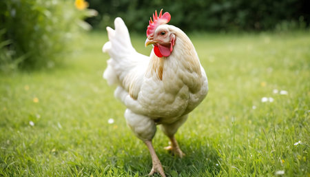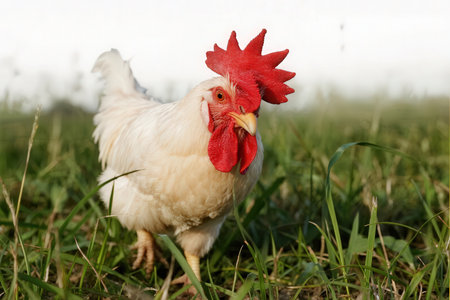 A proud white rooster with a vibrant red comb stands in a lush green grassy field. The background is softly blurred, emphasizing the bird's detailed white plumage and farm setting.