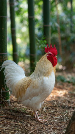 A striking rooster displays vivid plumage amidst a natural setting, possibly a farm or park. Its red comb and wattles contrast with creamy feathers. Tall bamboo trees create a blurred green backdrop. The image could be suitable for various commercial uses, including advertising and editorial content.