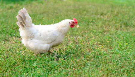 White chicken holds a piece of bread in its beak on the green grass on a traditional free range poultry, organic farm, grazing of the farm on the grass with copy space