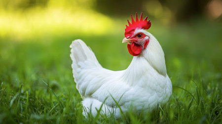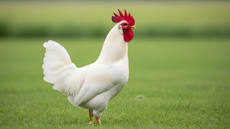A majestic white rooster stands proudly in a lush green field. Its bright red comb and wattles contrast strikingly against its clean white plumage and the soft, blurred green background of the farm environment.