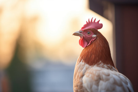 a rooster gracefully strolls along a wooden dock, bathed in the warm glow of a sunset. this captivating image captures the essence of ethical concerns and pop-culture influences. the rooster's light brown and white feathers create a stunning contrast against the backdrop. with dignified poses, this nonrepresentational photograph, shot on fujifilm velvia, showcases the sheer beauty of nature. ai generated