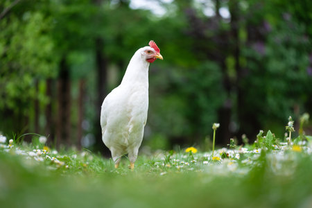 a white hen is walking along the green grass. walking healthy happy farm animal
