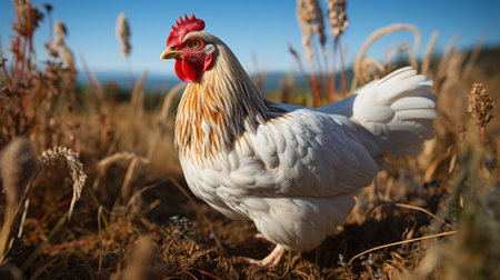 White rooster walking in field farm. Chicken on traditional free range farm.