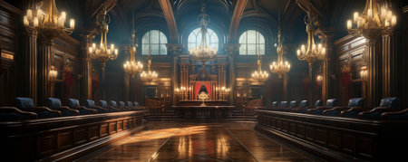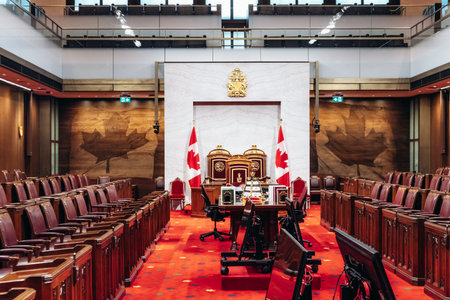 Ottawa, Canada - August 13, 2025: Interior view of the Senate Chamber inside the Senate of Canada Building, showing the red carpet, seating, desks, and ceremonial thrones