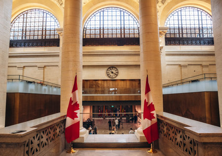 Ottawa, Canada - August 13, 2025: Interior view of the Senate of Canada Building with two Canadian flags, tall stone columns, large arched windows, and people gathered in the hall below.
