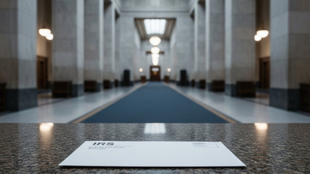 An extreme wide, cinematic shot capturing the overwhelming scale of federal bureaucracy. A single, s