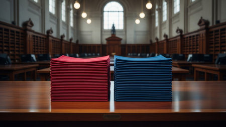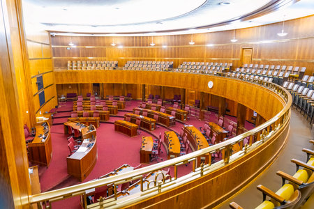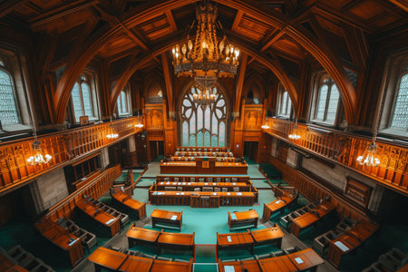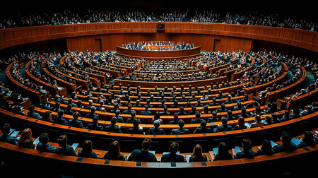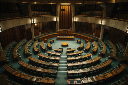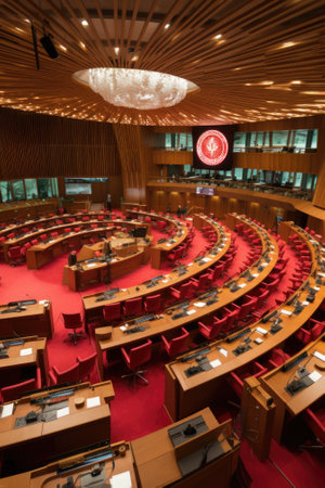 Top-down view highlights the organized layout of parliamentary seating with microphones, reflecting an institutional atmosphere conducive to discussions.