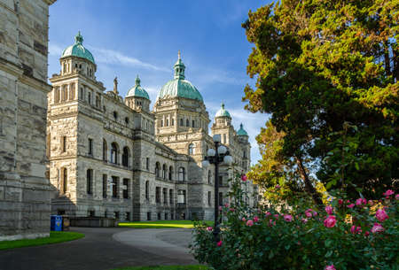 Beautiful view of British Columbia Parliament Buildings with rose flowerbed in Victoria, Canada