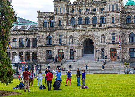 Victoria, BC, Canada - April 14 2021 : British Columbia Parliament Buildings. Legislative Assembly Fountain.