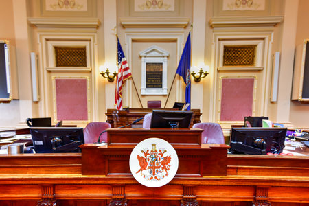Trenton, New Jersey, United States of America – September 6, 2016. The General Assembly chamber of New Jersey State House in Trenton, NJ. This is where the state’s 80 General Assembly members debate and vote on ideas for new laws.