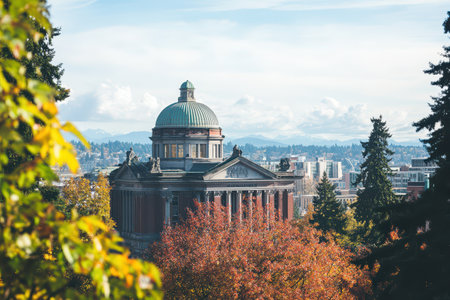 A grand historic structure with a green dome is surrounded by vibrant autumn leaves. It overlooks a bustling urban area on a clear day.