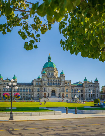 Downtown Victoria, Vancouver Island, BC, Canada - August 18, 2021: Legislative Assembly of British Columbia in the Capital City during a sunny summer sunset.