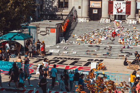 Vancouver, Canada - July 1,2022: View of sign No Pride in Genocide as part of protest against celebration of Canada day in front of Vancouver Art Gallery