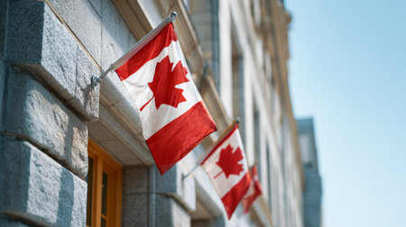 Two canadian flags waving proudly on the side of a building, celebrating national pride and identity in a vibrant urban setting, embodying the spirit of canada