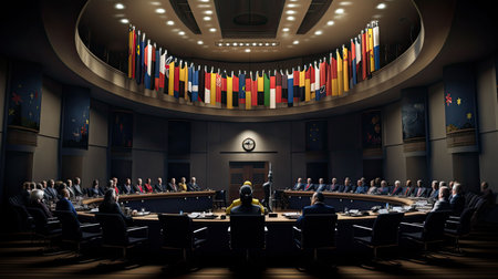 A senior male politician in a suit delivers a speech at an international conference, addressing diverse delegates in a hall adorned with various national flags.