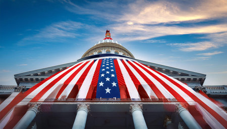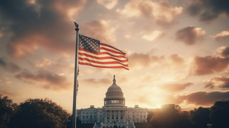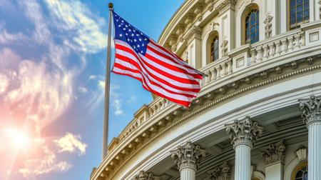 Flag of the United States billowing in the breeze near a historic government building, highlighting national pride and architectural beauty in a vibrant atmosphere
