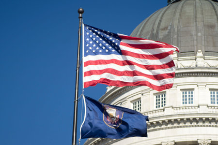 United States and Utah State Flag in front of Utah State Capitol