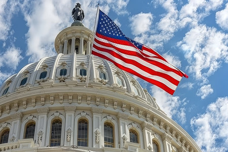 USA Washington DC Capitol detail with waving American flag, blue sky