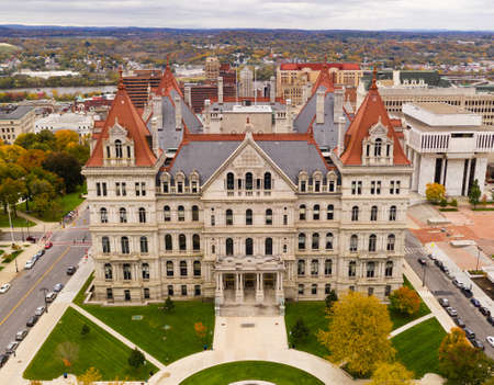 Its a crisp cold day in Albany New York downtown at the statehouse in the aerial view