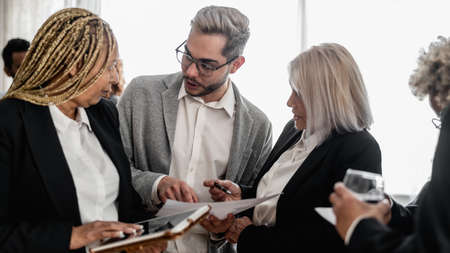 Medium shot of business team reviewing blockchainbased verification system for maintaining integrity and trust in crossindustry document handling.