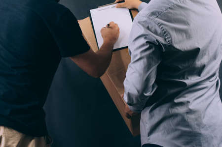 A man with a cardboard box and documents in his hands, hands over the parcel to the client. Delivery service concept on dark background