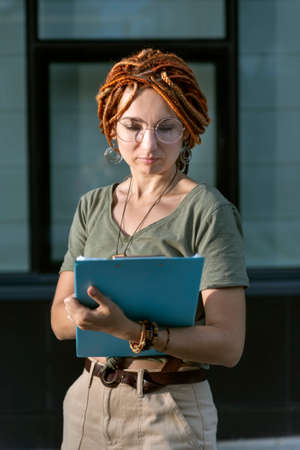 Young caucasian girl student with red dreadlocks stands and writes in a tablet against office building background. Young worker with an informal appearance.
