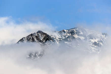 Majestic rugged peaks cloaked in snow rise through swirling fog, evoking serenity and awesome in a high-altitude winter landscape.