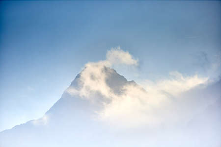 Minimalist sunny mountain landscape with snow-covered mountain top in golden sunshine in clear blue sky. Minimal alpine scenery with high snowy pinnacle in sunlight. Snow on sharp rocks on pointy peak