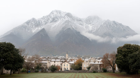 Mountain village on foggy day, italian alps, on the north of Lombardia. Village town in Europe. Beautiful rural landscape. Autumn rain and fog on the mountain hills. Discover concept