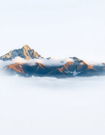 This stunning image captures a snow-capped mountain range bathed in soft morning light. The mist adds a tranquil touch to the expansive landscape, inviting exploration.