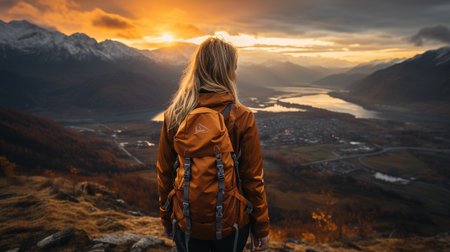 On the summit of the mountain, a young woman tourist enjoying the sunset. A traveler against a mountainous backdrop.