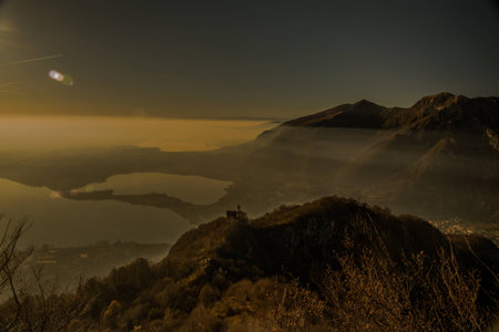 Great landscape at lake Iseo in winter season. Foggy and humidity in the air. Panorama from Monte Pora, Italian Alps, Italy