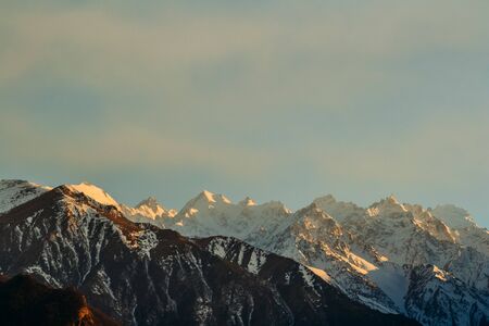 Landscape in the Arkhyz Biosphere Reserve, Russian Federation. Mountains covered with snow in the Arkhyz biosphere reserve in the evening