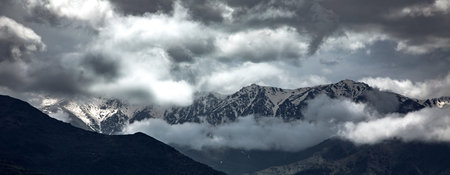 Panoramic view of mountain range in the clouds. Caucasus, Russia