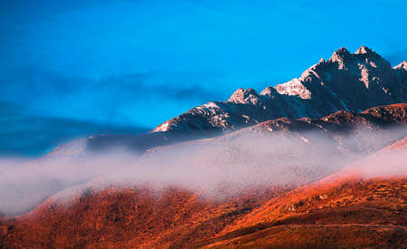 Awesome mountain landscape with black peaked top with white snow in golden sunshine under blue sky. Beautiful snow-covered pointy peak in gold sunlight. Atmospheric mountain scenery with peaked top.