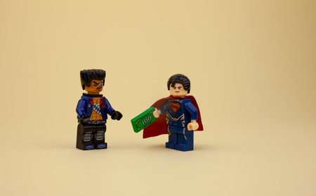 Ukraine, Kyiv - April 6, 2020: lego minifigures. Superman gives a hundred dollars. Get paid in cash. To give a bribe. Toys. Lego toy men. Copy space.