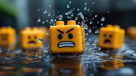 Child's hand picking colorful plastic building blocks on a wet surface with water droplets.