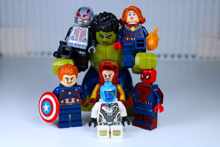 Detroit, USA - June 8, 2020: The Avengers. Ironman, Spiderman, Captain America, Captain Marvel, Antman and the HULK. Lego Minifigures. Studio shot.