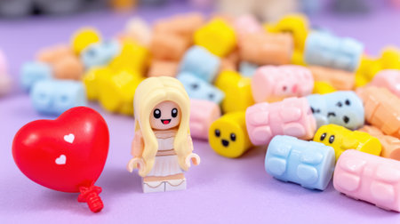 A charming Lego minifigure with blonde hair stands next to a vibrant red heart-shaped balloon, surrounded by a playful scattering of colorful candy puffs on a soft purple surface. The scene evokes a sense of joy and childhood wonder.