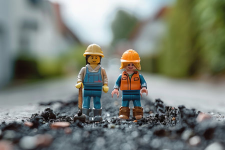 Brightly colored toy figures representing construction personnel are arranged side by side, with a vibrant orange figure drawing attention, highlighting unity and varied