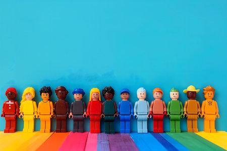 A joyful arrangement of colorful toy figures in a precise lineup, each representing individuality yet united in purpose, ideal for conveying themes of diversity and unity, banner