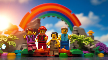 Lego minifigures in front of a rainbow background