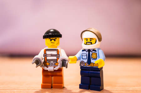 Tambov, Russian Federation - August 29, 2015 Lego policeman minifigure with handcuffs going to arrest from his working place with computer and cup on Lego gray baseplate background. Studio shot.